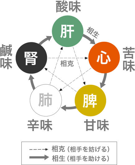 この五つの味には、体の機能を司る五臓を補う働きがあります。そのため、カラダのある部分が疲れているとそれに対応する味が欲しくなります。例えば、腎が弱っていると「鹹(塩)味」を欲し、肝が弱っていると「酸味」を欲し、心が弱っていると「苦味」を欲するように、その欲する味によりカラダのどこが疲れているのかが分かるようになります。